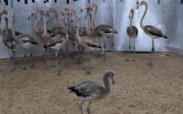 Jonge flamingo’s Avifauna verhuizen naar nieuwe volière in Franse dierentuin