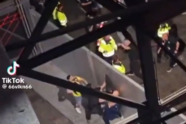 De verdachten, de 32-jarige Olcay K. en de 21-jarige Batin T., gooiden samen een paal met een betonnen voet van ruim 23 kilo over een scheidingswand. De paal kwam terecht op het hoofd van een Feyenoord-medewerker, die daarbij een hoofdwond, een gebroken duim en een zware hersenschudding opliep.